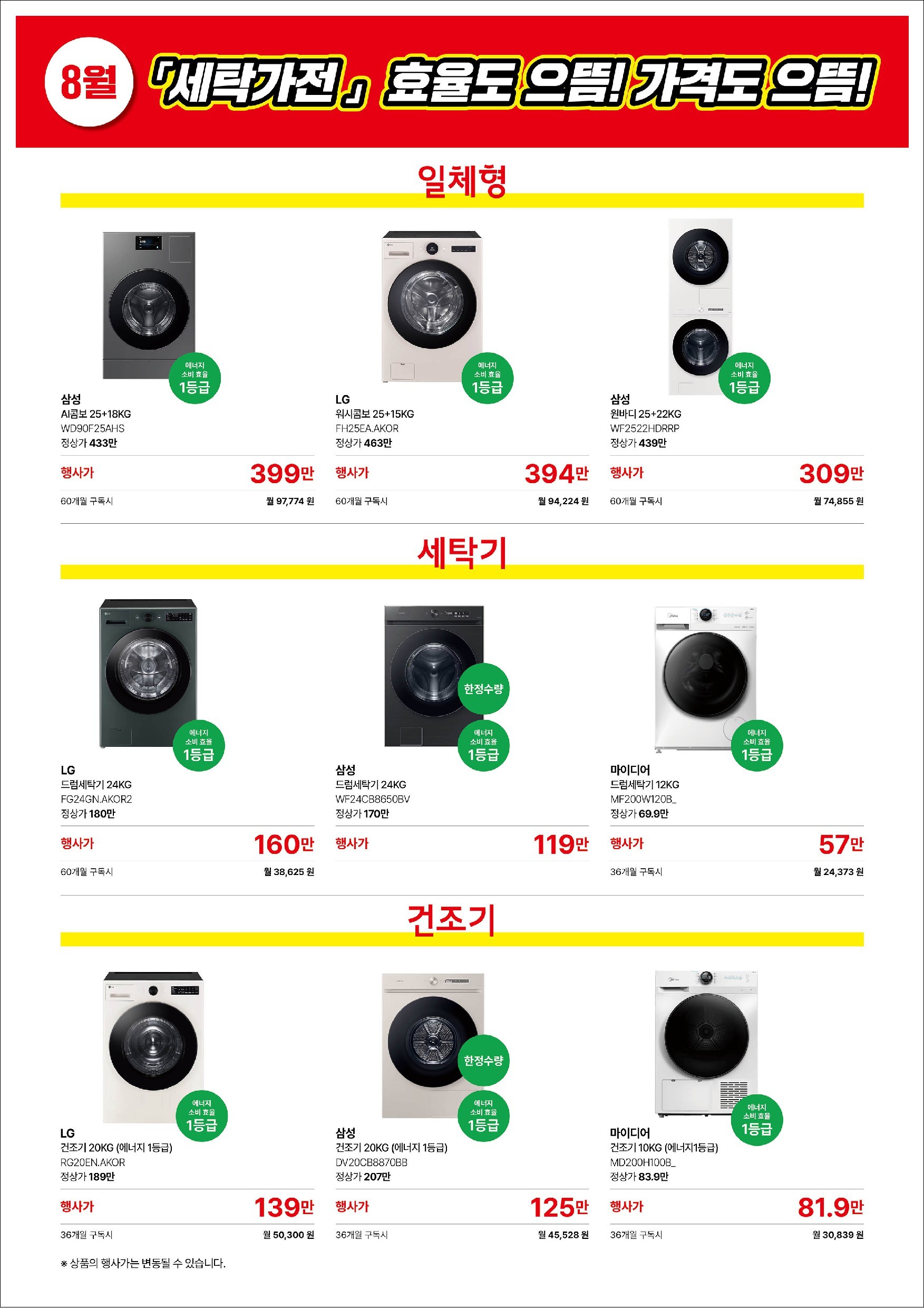 세탁+건조 일체형 콤보는 물론, 세탁기·건조기 단품 모델도 한정수량 파격행사!!