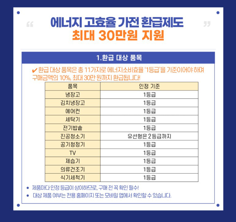 - 내용 : 에너지소비효율 1등급 가전제품(일부 품목 2등급 포함)을 구매하면 구매금액의 10% 환급