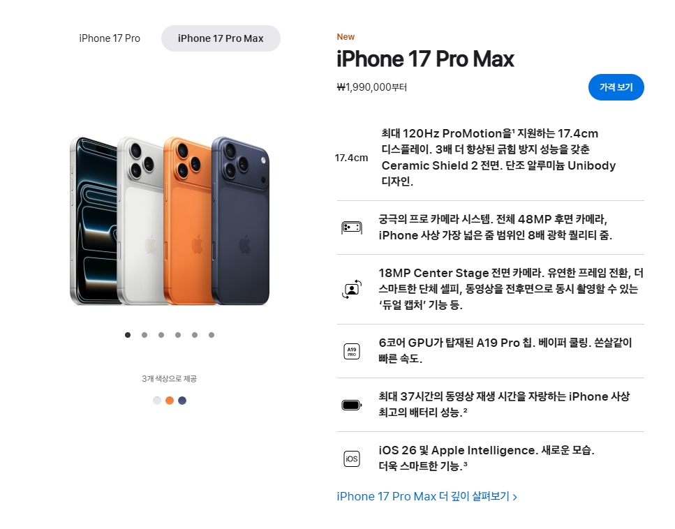 - 카메라 : 모든 렌즈 48MP, Pro Max는 최대 8배 줌 지원