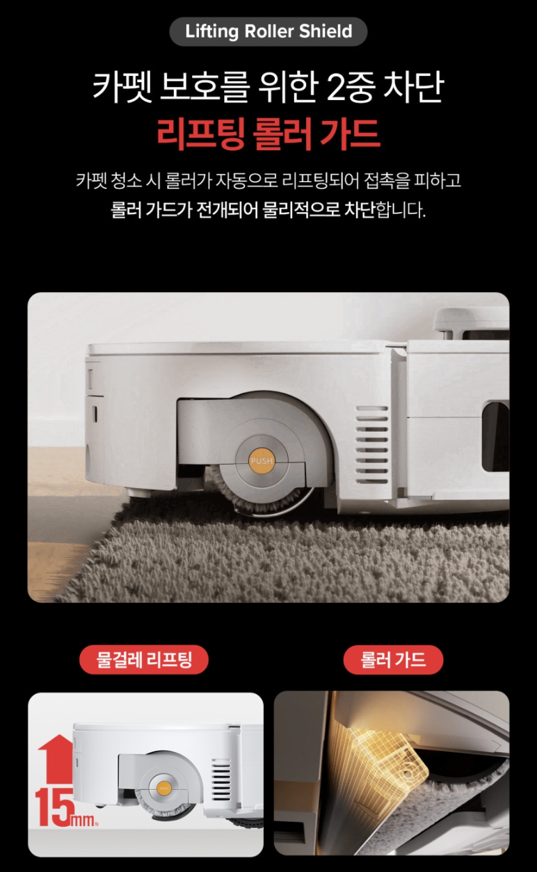 여기에 '롤러 쉴드'까지 작동해 물기가 카펫에 닿는 것을 원천 차단합니다.