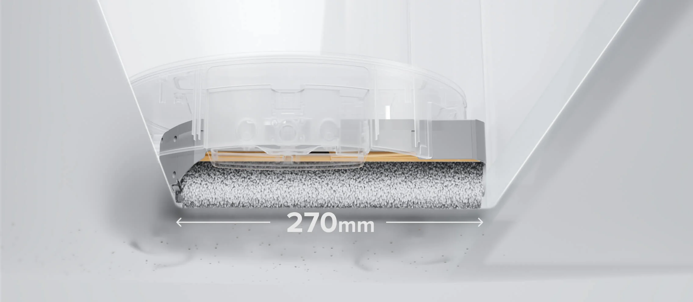 바닥을 누르는 힘이 기존 대비 2.5배 강해졌습니다. 말라붙은 케첩, 커피 자국도 사람이 손걸레질하듯 꾹 눌러 닦습니다. - 270mm 광폭 롤러 :