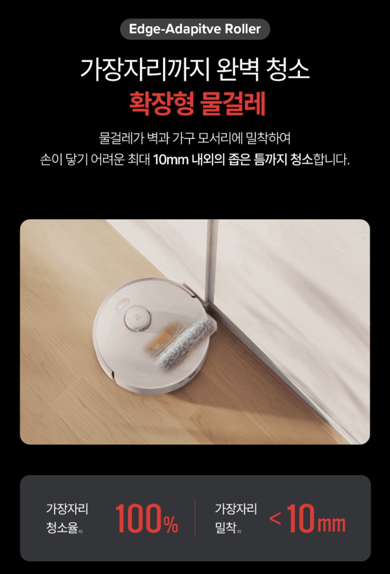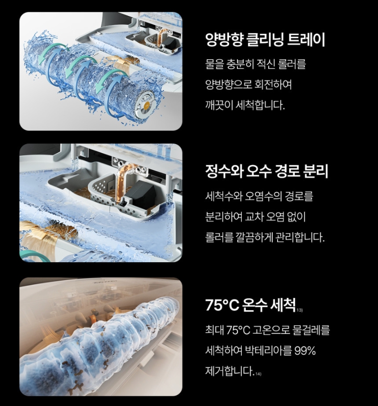 - 작동 원리 : 로봇 내부에서 깨끗한 물을 계속 뿌려 롤러를 씻어내고, 오염된 물은 즉시 흡입합니다.
