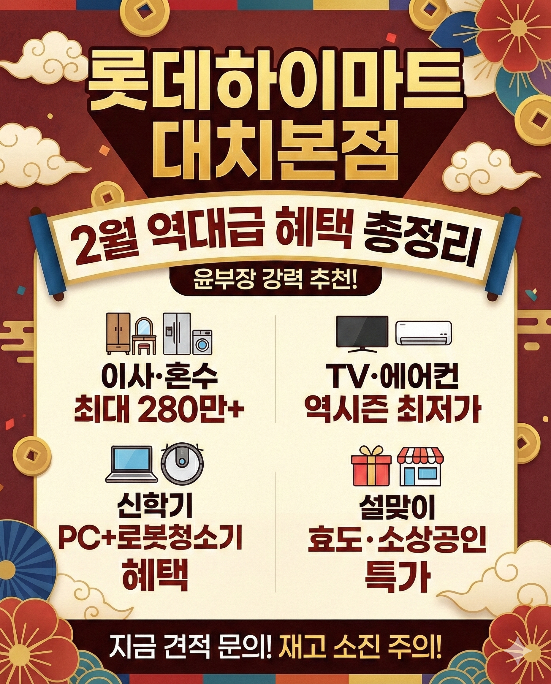 #롯데하이마트대치본점 #하이마트대치본점 #대치동하이마트 #강남하이마트 #강남가전매장 #대치역하이마트 #신혼가전 #혼수가전 #입주가전 #이사가전 #혼수가전견적 #신혼가전졸업 #가전견적비교 #강남혼수 #2월가전세일 #졸업선물 #입학선물 #노트북추천 #대학생노트북 #설효도선물 #명절선물 #에어컨역시즌 #에어컨최저가 #시스템에어컨 #77인치TV #로봇청소기추천 #LG그램2026 #갤럭시북5프로 #애플 #안마의자