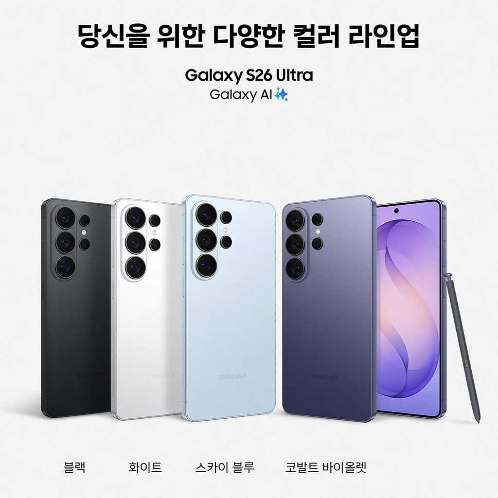 이번 갤S26 울트라(일반, 플러스도 동일)는 4가지(블랙, 화이트, 스카이 블루, 코발트 바이올렛) 컬러로 나왔습니다. 비유하자면, 청담동 고급 테일러샵에서 내 피부톤과 취향에 딱 맞게 재단한 프리미엄 정장을 입는 느낌입니다.