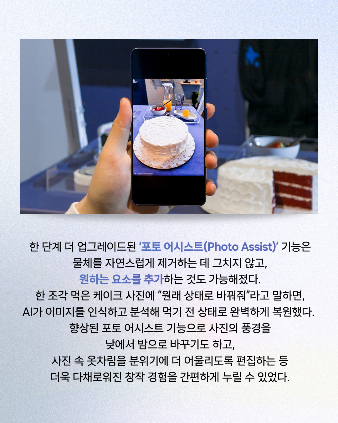 여기에 한 단계 더 업그레이드된 '포토 어시스트'는 그야말로 혁명입니다. 기존처럼 물체를 지우는 것을 넘어, 이제는 '원하는 요소를 추가'하거나 '복원'하는 창조가 가능해졌습니다.